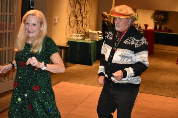 As we headed through the lobby of the Inn at Pasatiempo we spotted the registration table manned by Dana Ambrisko, Kris Vanacore, Emily Highly and Honore D’Angelo. Hmmm… indulge me here, can I say …table staffed by the ladies? Great familiar old time rock ‘n roll tunes from The Jerry Sauceda Band emanated in the background adding to the ambiance while everyone mingled. Moving on to the next ‘station’, we picked up jingly bells and blinking Christmas light necklaces with which to adorn ourselves.  At this table we could also purchase additional raffle tickets for the benefit of Toys for Tots .