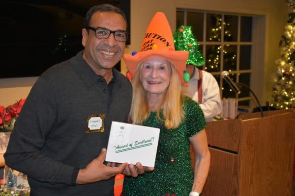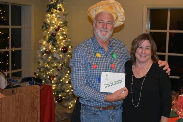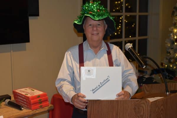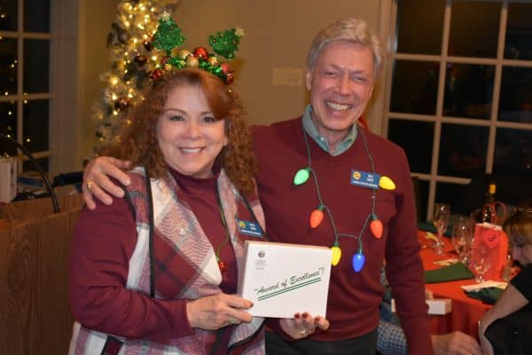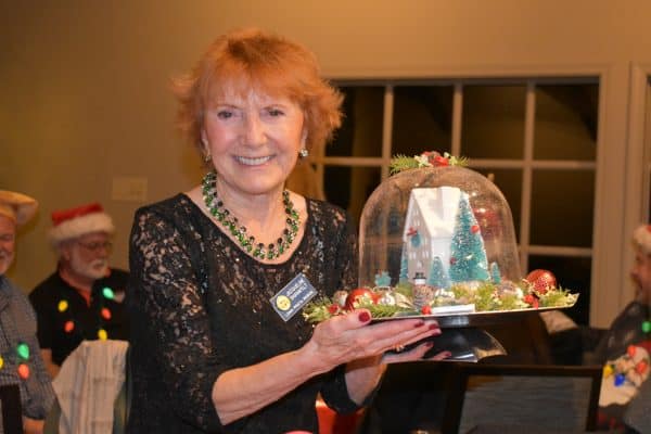 Dana Ambrisko was acknowledged for the INCREDIBLE centerpieces on each of our tables. They were hand constructed by Dana and I was in total awe, knowing the hours she must have put into this work. A clear dome covered a miniature winter home scene that centered on a white house adorned with a wreath and snow-covered evergreen trees and yard. There were walkways of pebbles, bushes of moss and scattered ‘logs’. On close inspection one could spot a snowman and miniature Porsche with Christmas tree tied to the roof. Amazing! And in a spirit of generosity Dana made extras that were raffled off, bringing in $165.00 for Toys for Tots.
