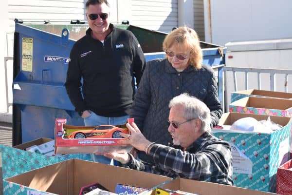 We briefly interrupted the progress of these busy bees as they helped get the toys out of our car. We herded Joey over for a photo as I handed him $255 in cash for additional purchases (he supports several toy related charities.)