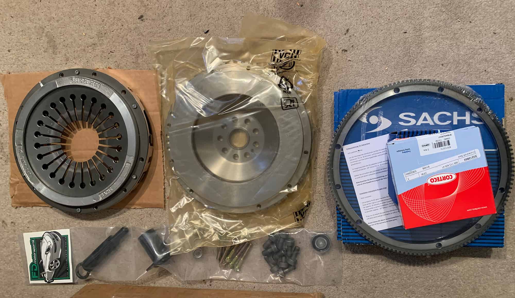 I bought my ’95 midnight blue 993 back in 2012 with 68k miles. Eight years and over 50k glorious miles later I decided that I couldn’t wait any longer for the clutch to fail. It was time to put on an RS light weight flywheel & clutch. I went with the RS flywheel and friction disk but retained the stock pressure plate because I wasn’t doing any engine power modifications. Honestly, I loved how the original clutch operated and didn’t want to mess with that feel. Here’s the kit: