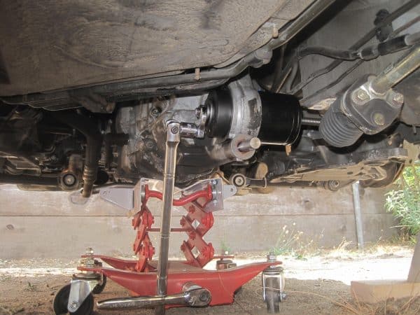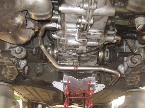 OK, the tranny mount has to come out. How bad can it be. Maybe if I just take the front subframe crossmember out there will be enough room. With amazing proficiency I raised the car, removed the undertrays and gear selector, removed the front subframe crossmember and secured the transmission jack to the transmission. I removed the 6 transmission mount crossmember bolts and slowly lowered the transmission until it contacted the rear subframe crossmember. Was there enough room to get to the transmission mount? My heart sank; we were really putting the Nein back into 993. The bolt hole barely cleared the tunnel and there was no way I was going to get the extractor hardware bolted up.