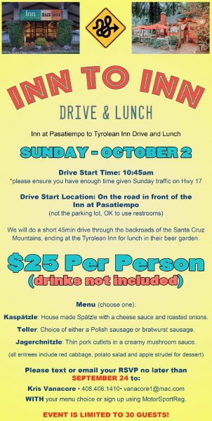 A short drive through the back roads of Santa Cruz County, with a delightful ending at the Tyrolean Inn in Ben Lomond for lunch.