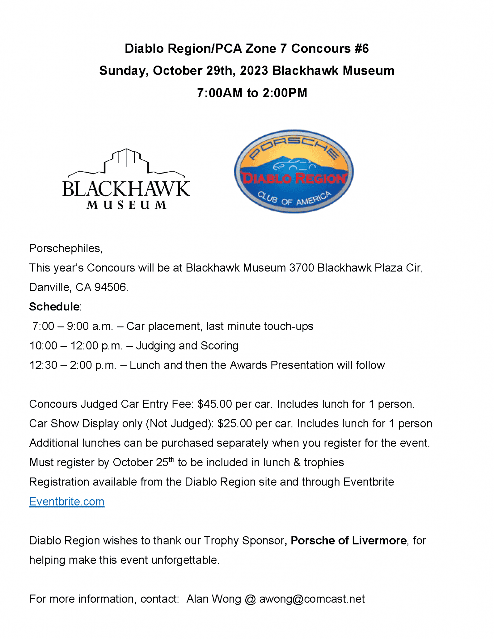 Diablo Region/PCA Zone 7 Concours #6 Sunday, October 29thBy Loma Prieta / October 24, 2023 Click to email Alan for information