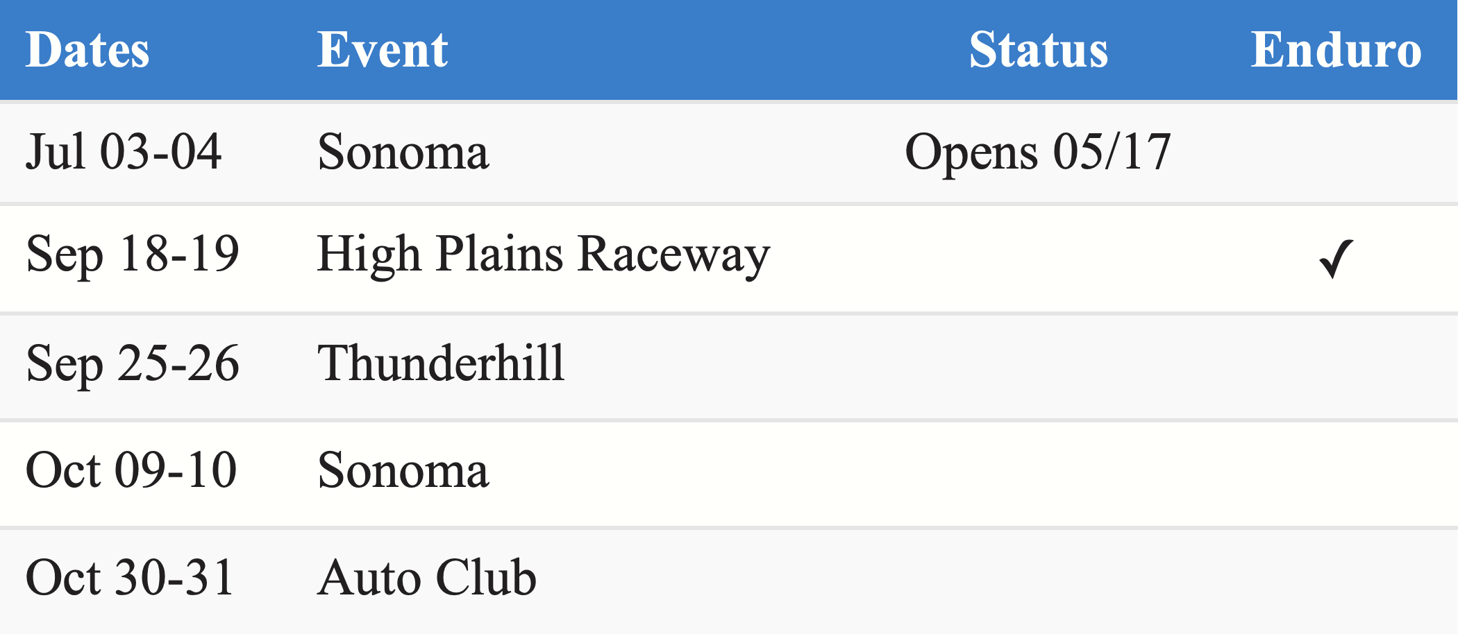 With Federal and State directives pertaining to the COVID-19 pandemic, the Club Racing schedule is very fluid and subject to change on a day-to-day basis. The racing schedule shown below will be frequently updated with the latest official status of each of our races.