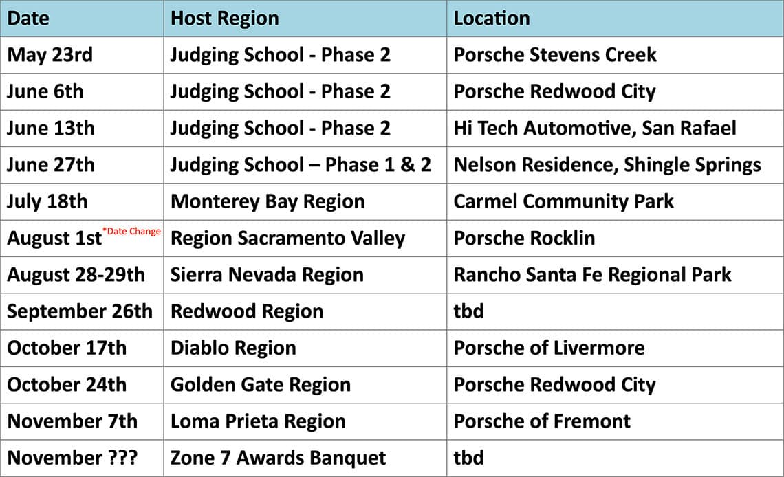 Due to the popularity of this school, an additional one-day in person school has been scheduled in cooperation with the Sacramento Valley Region on June 27th at a private residence in the area. Registration is limited to 20 students. You can register at: https://www.motorsportreg.com/events/zone-7-concours-clinic-judging-school-nelson-residence-pca-073413