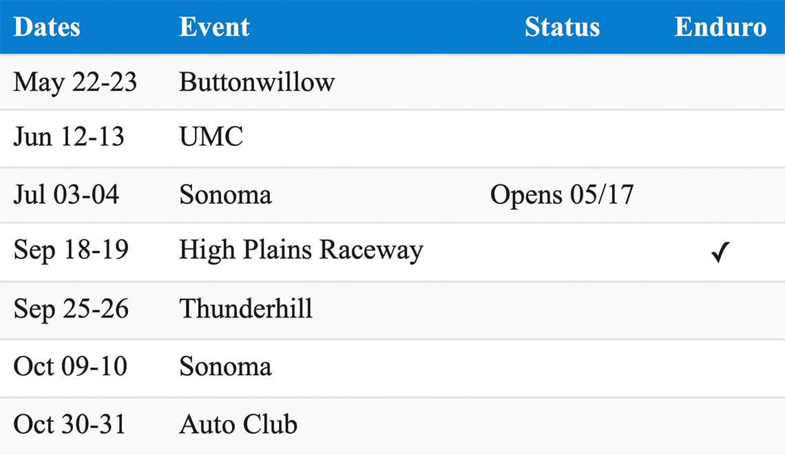 With Federal and State directives pertaining to the COVID-19 pandemic, the Club Racing schedule is very fluid and subject to change on a day-to-day basis. The racing schedule shown below will be frequently updated with the latest official status of each of our races.