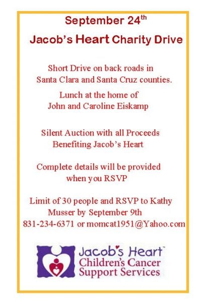 Jacob’s Heart Tour, September 24 2022By Loma Prieta / August 3, 2022 Join the tour to benefit Jacob’s Heart.RSVP with Kathy Musser by September 9.