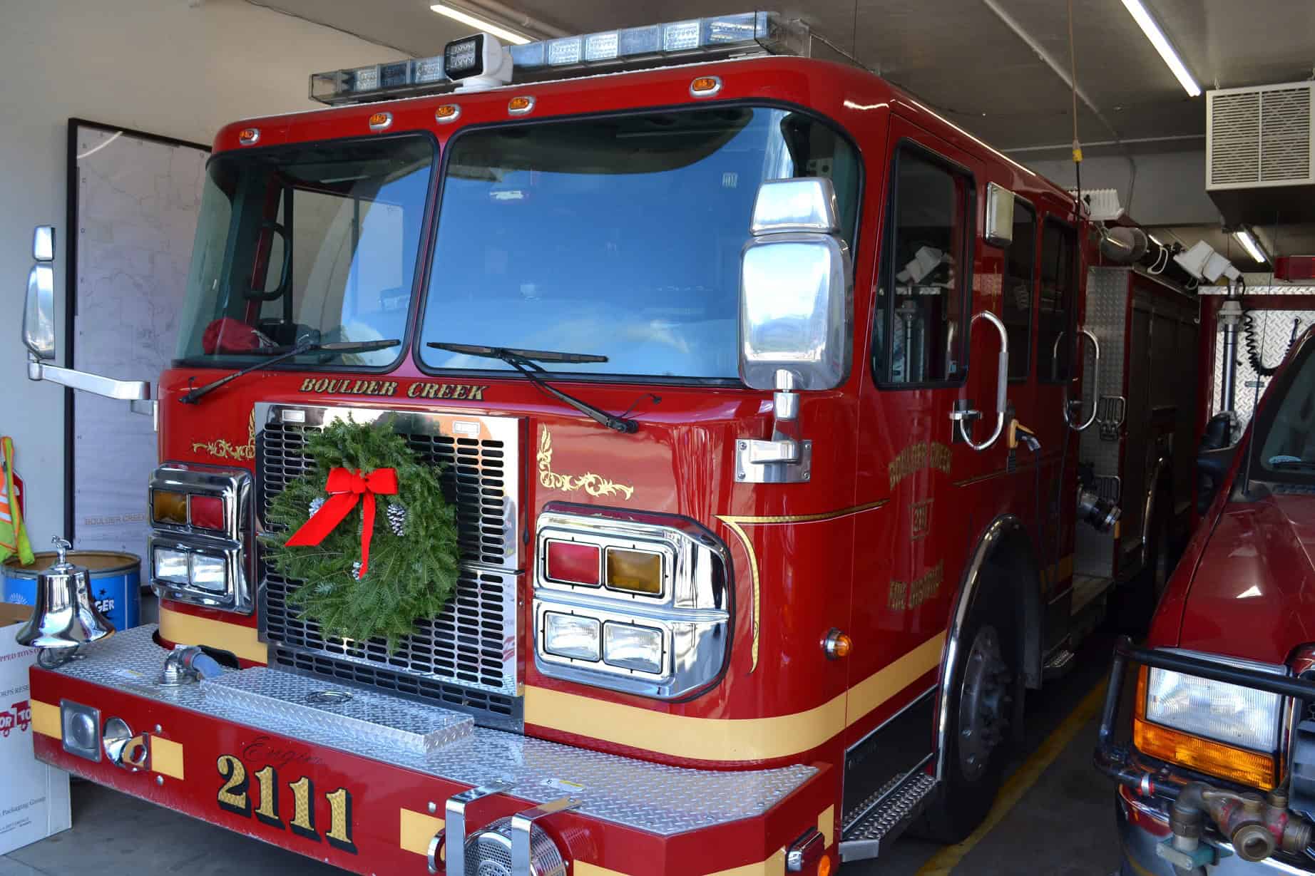 Fire engine decorated for Christmas at the Boulder Creekd Fire Station.