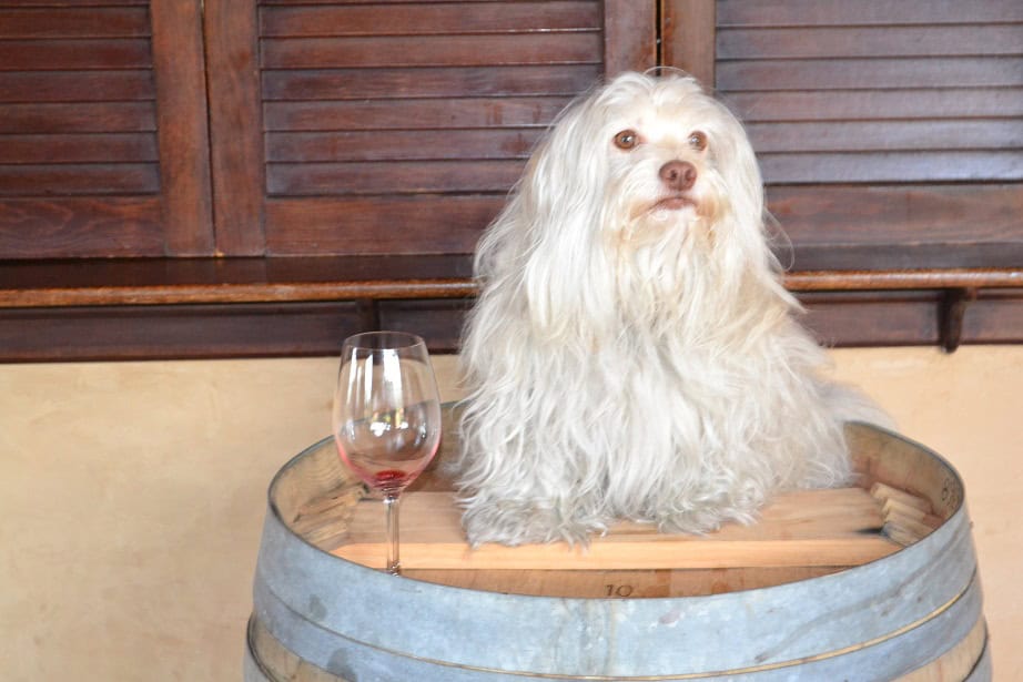 Farley looks a little forlorn sitting on the wine barrel at Byington winery. Maybe it's because his glass is empty.