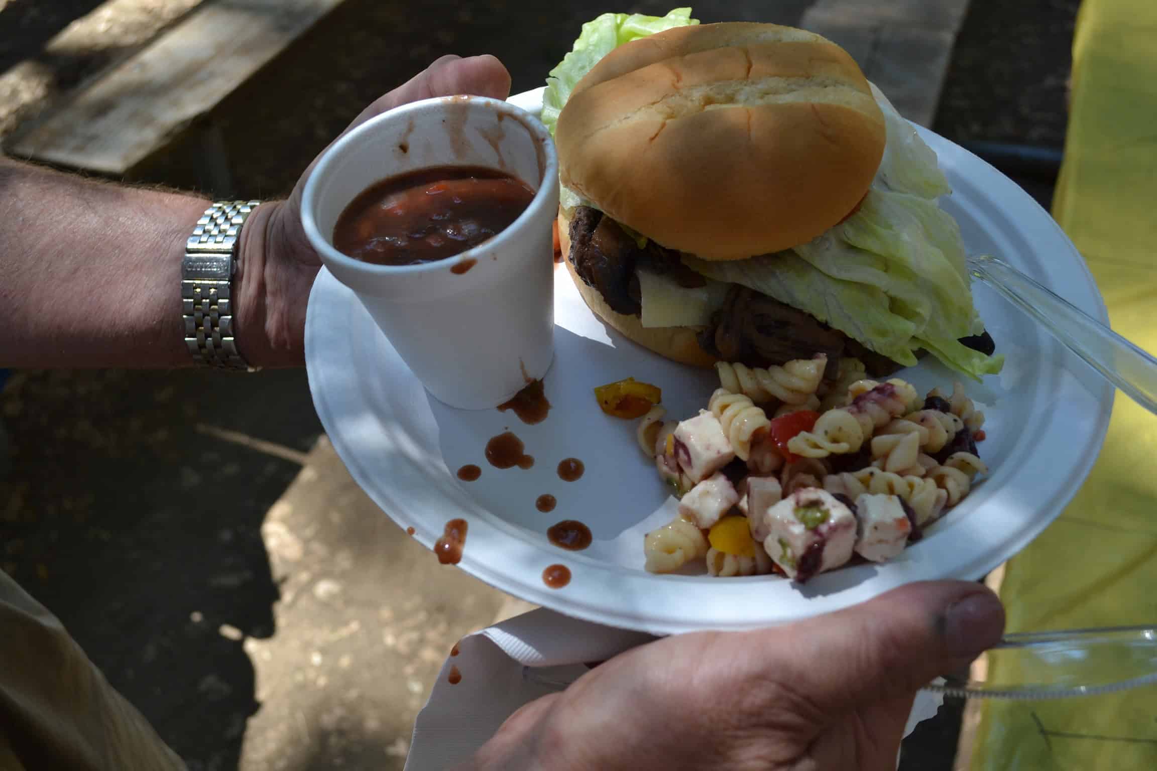 A beautiful hamburger, pasta salad and a cup of beans; a premium picnic plate and what looks like the beginning of a beautiful relationship!