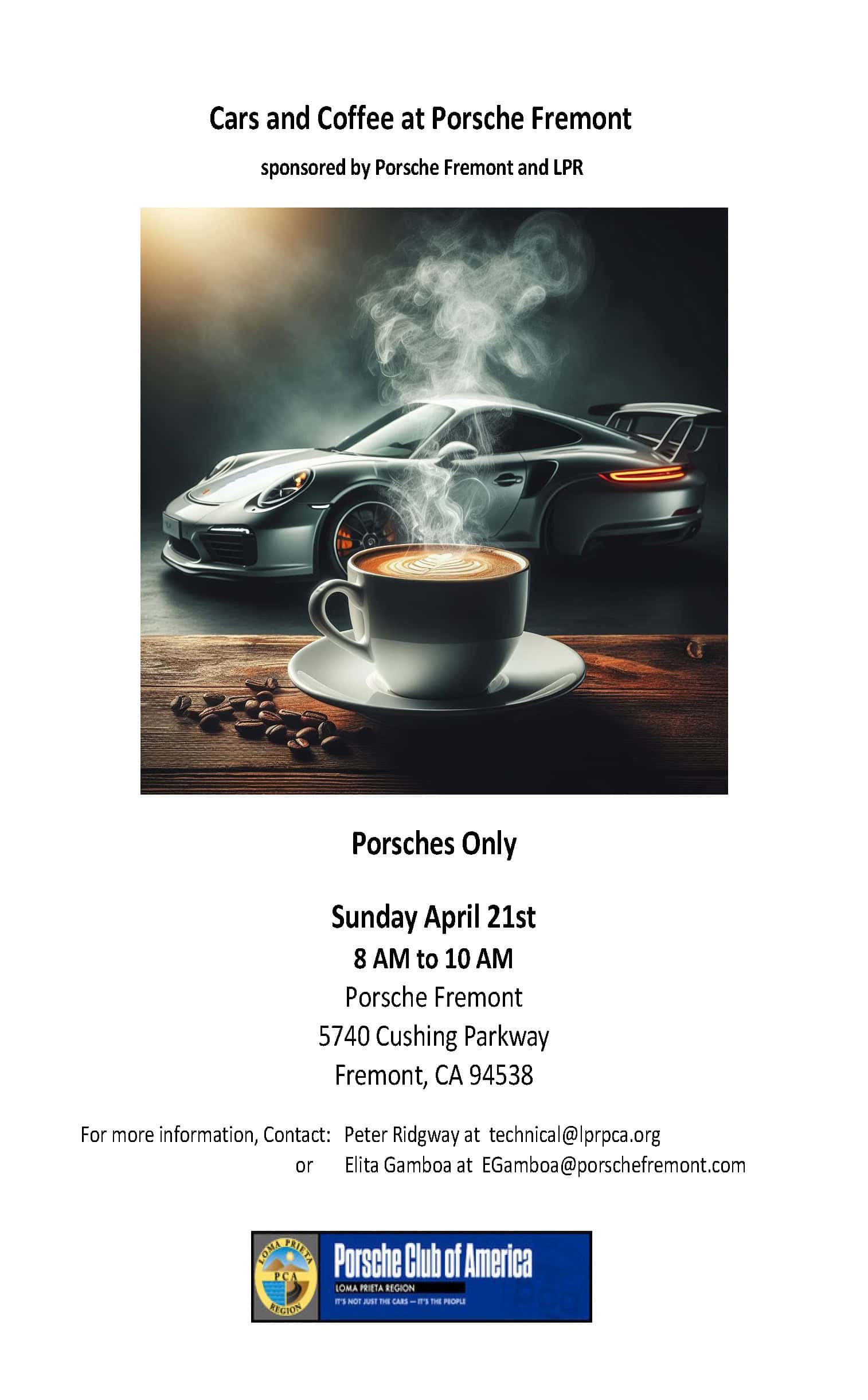 Porsche Fremont Cars and CoffeeBy Loma Prieta / February 18, 2024 For more information email Peter Ridgway or Elita Gamboa