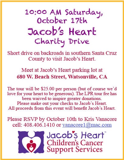 We will meet at 10:00am in the Jacob’s Heart parking lot at 680 W. Beach Street, Watsonville, CA. PCA required Covid 19 forms and LPR liability forms will be required for all attendees as are masks when not driving.