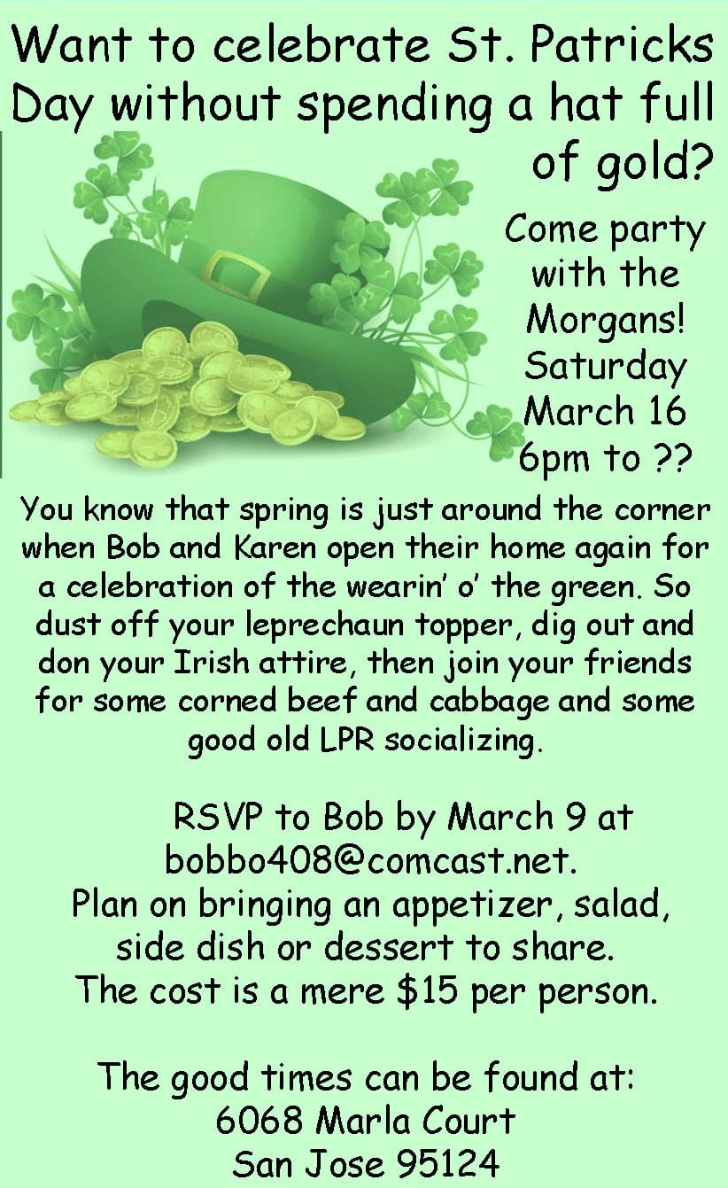 St. Patrick’s GTG 2024By Loma Prieta / February 1, 2024 Click the image to RSVP with Karen and Bob!In heaven, there is no beer; that’s why we drink ours here.